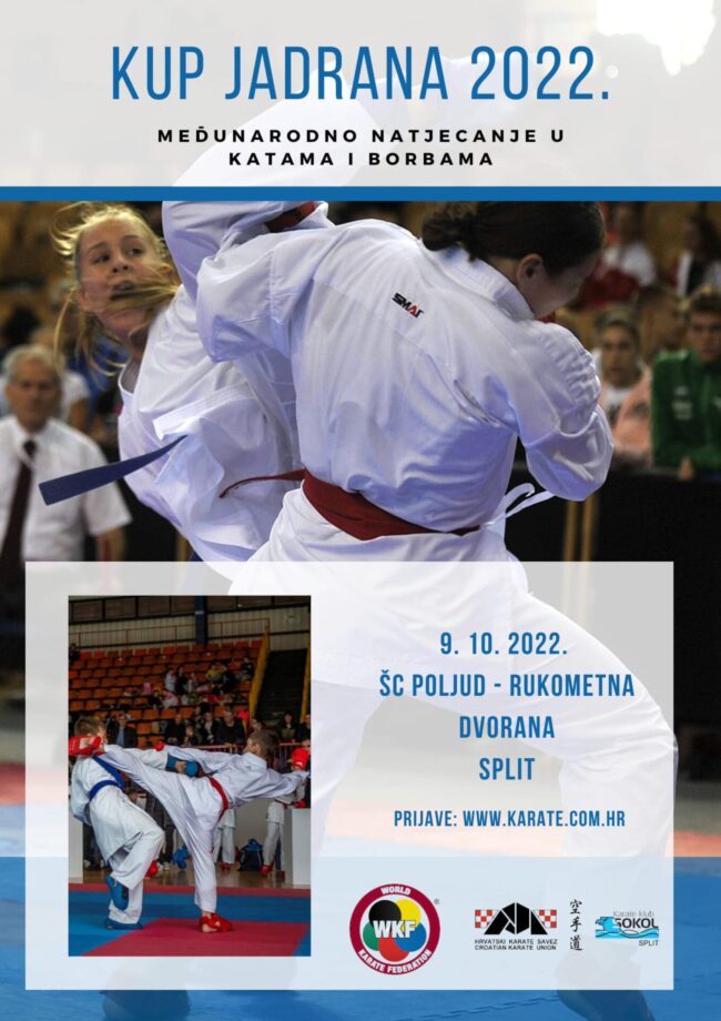 U nedjelju 09. listopada 2022. g. od 9 do 18 sati, u velikoj dvorani Š.C. Bazeni Poljud održat će se Kup Jadrana 2022, Međunarodno natjecanje u katama i borbama.