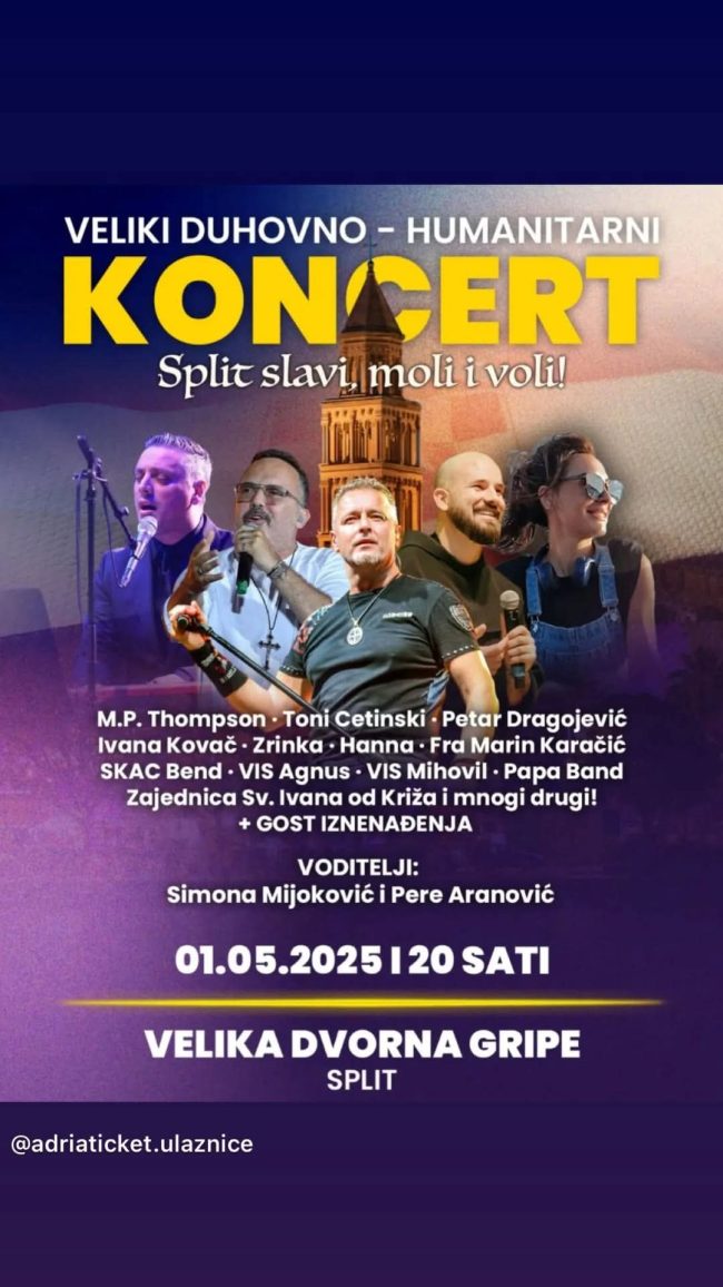 Sutra 1. svibnja s početkom u 20 sati u velikoj dvorani Š.C Gripe održat će se Humanitarni koncert duhovne glazbe “Split slavi, moli i voli”.