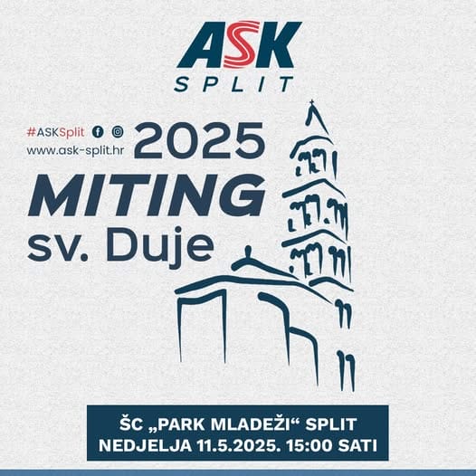 Ove nedjelje 11.svibnja 2025.g. u organizaciji Atletskog sportskog kluba “ASK” održat će se tradicionalni atletski Miting sv. Duje 2025. Dođite, podržite vrhunske atletičare i uživajte u prekrasnom ambijentu ŠC Park Mladeži.