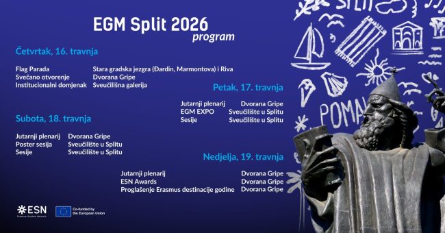 Od 16. do 19. travnja 2026. godine Split će ugostiti Erasmus Generation Meeting (EGM), najveću konferenciju organiziranu od strane studenata u Europi, posvećenu internacionalizaciji visokog obrazovanja i razvoju studentske mobilnosti. Događaj organiziraju volonteri Erasmus Studentske Mreže Split, a očekuje se više od 1300 sudionika iz cijele Europe i šire, uključujući studente, Erasmus+ alumnije, predstavnike sveučilišta,…